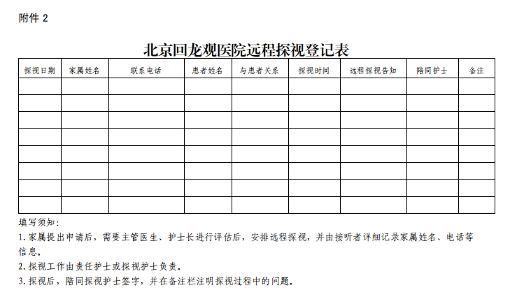 相关工作人员需及时填写《北京回龙观医院远程探视登记表》,并于次月 2 日前(节假日顺延)将登记表电子版上报护理部。