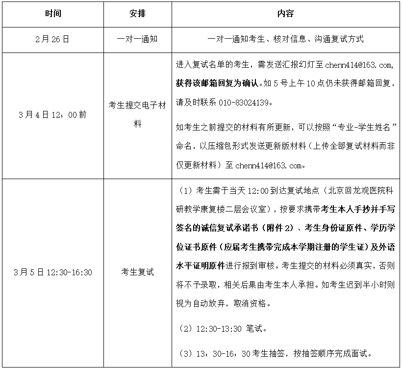 一、复试组织管理 本学院招生工作领导小组,负责本学院博士研究生招生复试录取工作中的统筹管理和监督检查工作,对学生的学术背景、硕士研究生期间的工作、综合能力、专家推荐、拟攻读博士学位的课题申请书等,进行审核评价。根据评价结果,确定考生复试名单。详见《北京大学回龙观临床医学院2026年博士研究生复试名单》。 二、复试时间与安排 (一)复试日程