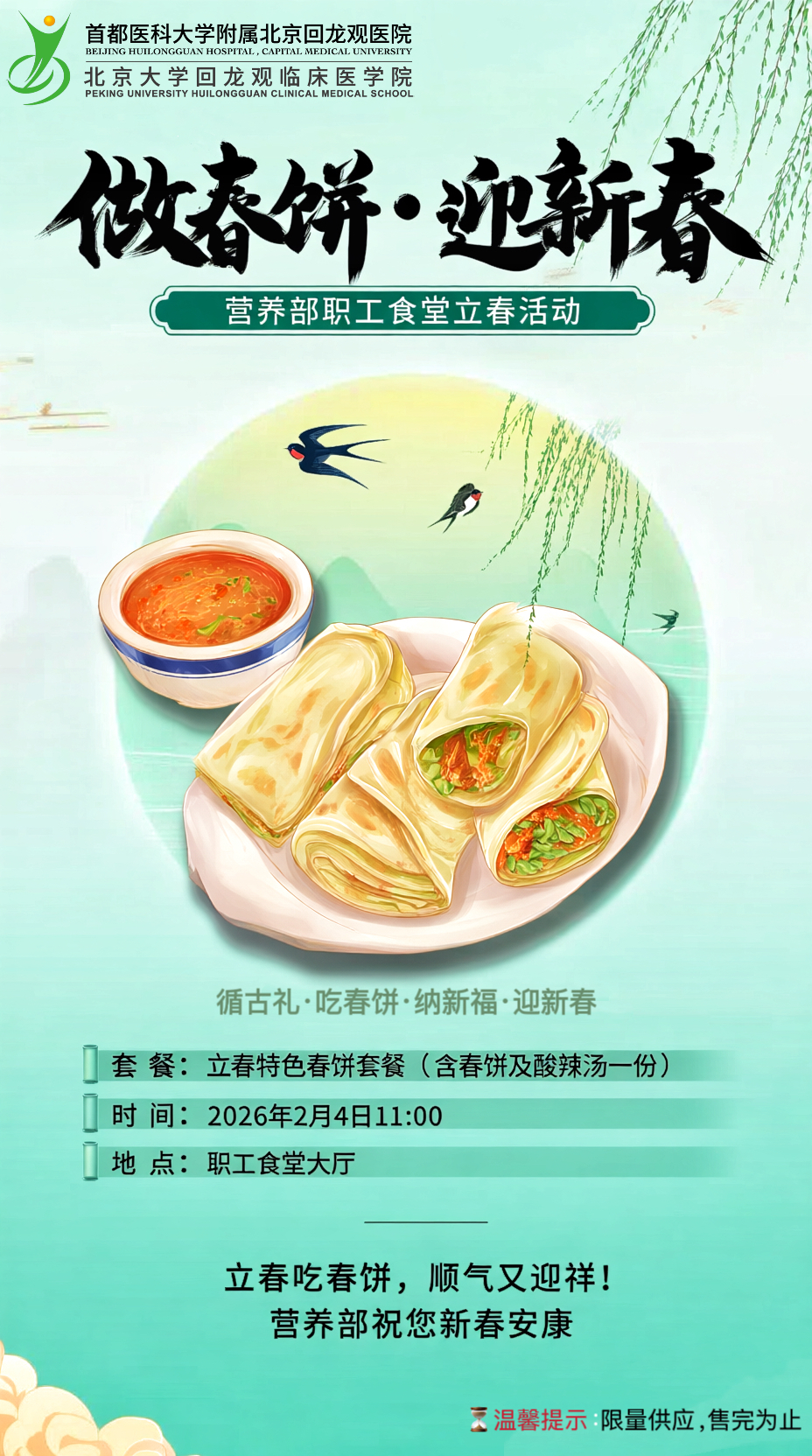 2026年2月4日立春之际,我院营养部职工食堂举办“做春饼·迎新春”活动,推出立春专属暖心套餐,春饼搭配酸辣汤的经典组合,为医院职工送上了一份兼具民俗韵味与营养关怀的节日福利。