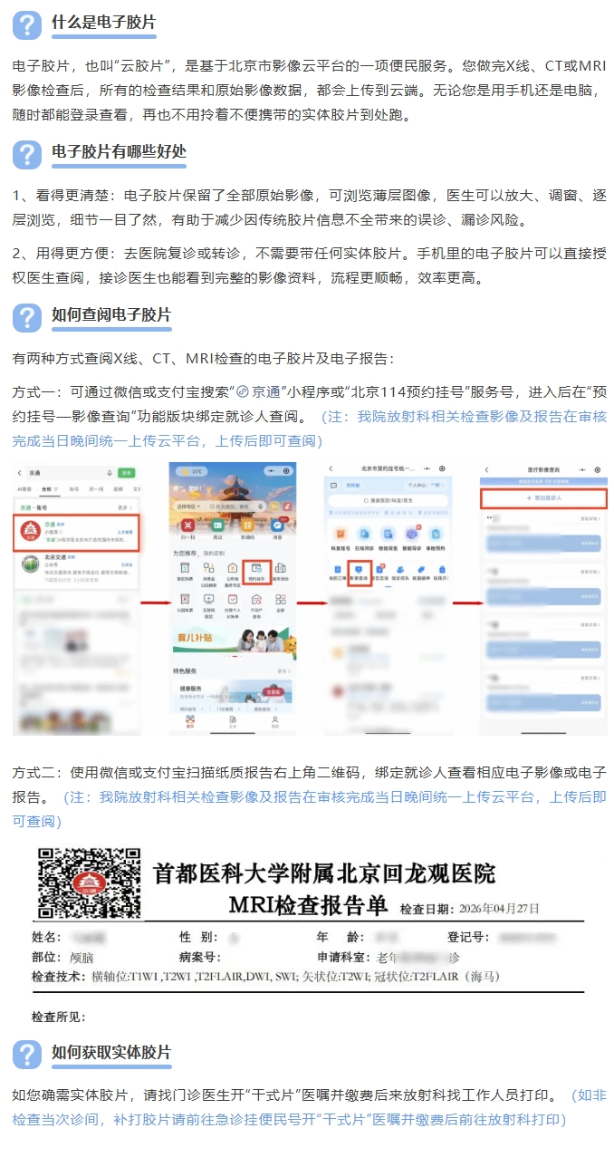 为持续优化就医体验,北京回龙观医院电子胶片便捷查询服务正式上线。患者无需再携带厚重实体胶片,通过手机端小程序即可跳转北京市影像云平台,查阅或分享近一年X线、CT及MRI检查影像及报告,让就医更省心、更便捷。