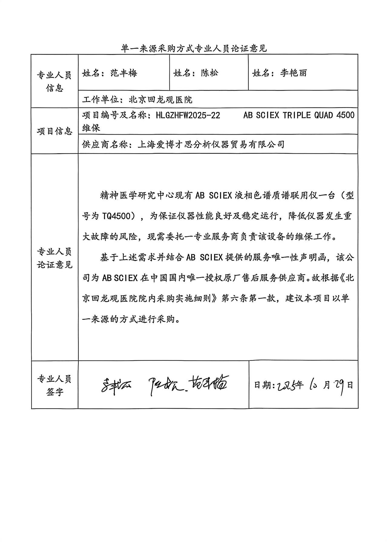基于上述需求并结合AB SCIEX提供的服务唯一性声明函,该公司为AB SCIEX在中国国内唯一授权原厂售后服务供应商。故根据《北京回龙观医院院内采购实施细则》第六条第一款,建议本项目以单一来源的方式进行采购。
