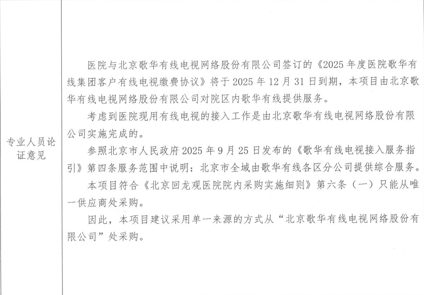 医院与北京歌华有线电视网络股份有限公司签订的《2025年度医院歌华有线集团客户有线电视缴费协议》将于2025年12月31日到期,本项目由北京歌华有线电视网络股份有限公司对院区内歌华有线提供服务。