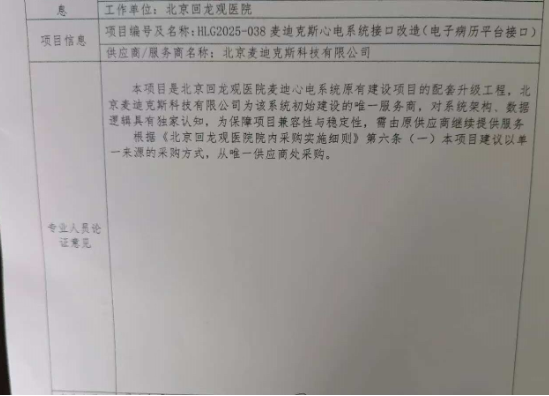 本项目是北京回龙观医院麦迪心电系统原有建设项目的配套升级工程,北京麦迪克斯科技有限公司为该系统初始建设的唯一服务商,对系统架构、数据逻辑具有独家认知,为保障项目兼容性与稳定性,需由原供应商继续提供服务,故申请单一来源采购。