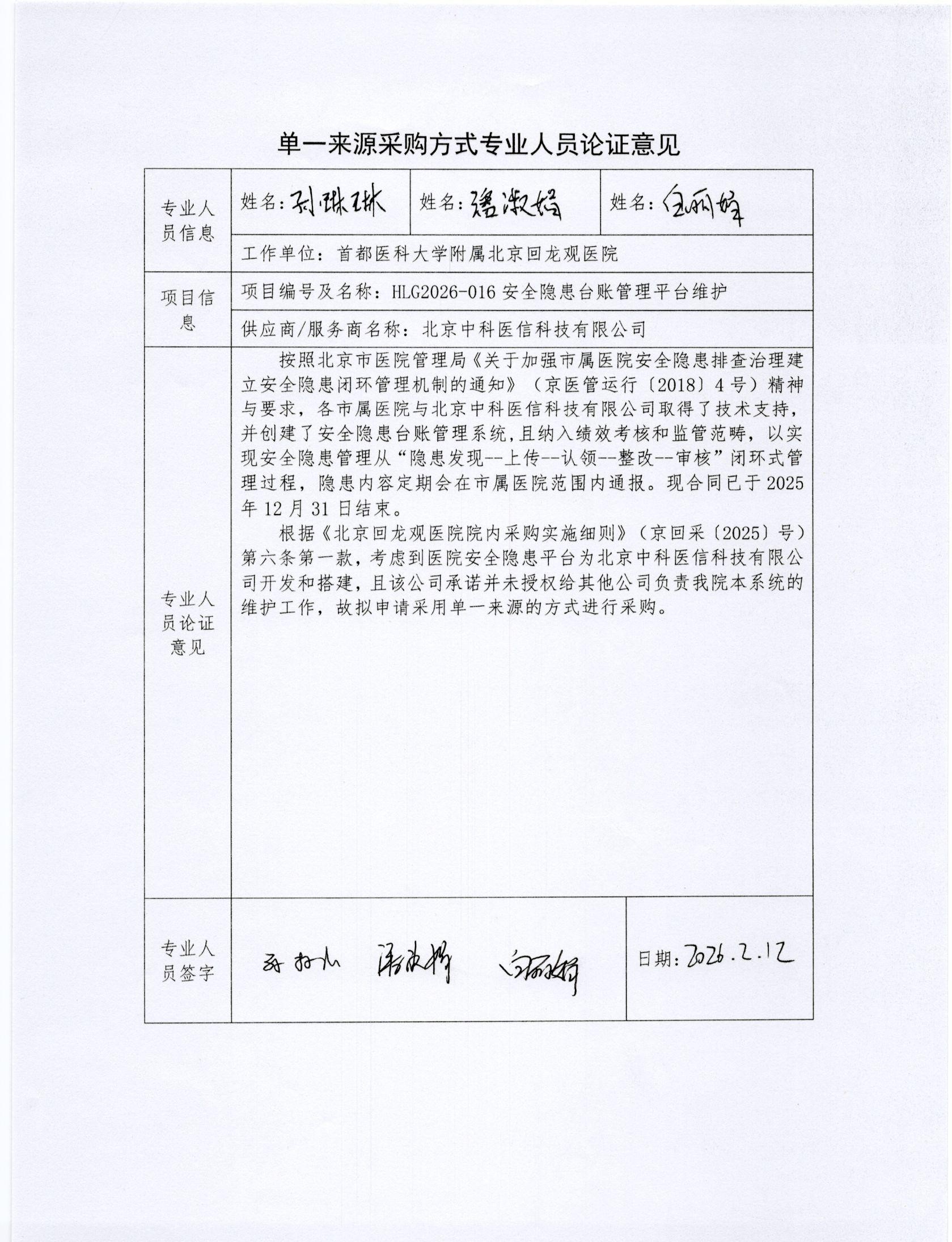 采用单一来源采购方式的原因及说明:根据《北京回龙观医院院内采购实施细则》(京回采〔2025〕号)第六条第一款,考虑到医院安全隐患平台为北京中科医信科技有限公司开发和搭建,且该公司承诺并未授权给其他公司负责我院本系统的维护工作,因此建议继续使用北京中科医信科技有限公司作为安全隐患台账管理平台维护服务商。